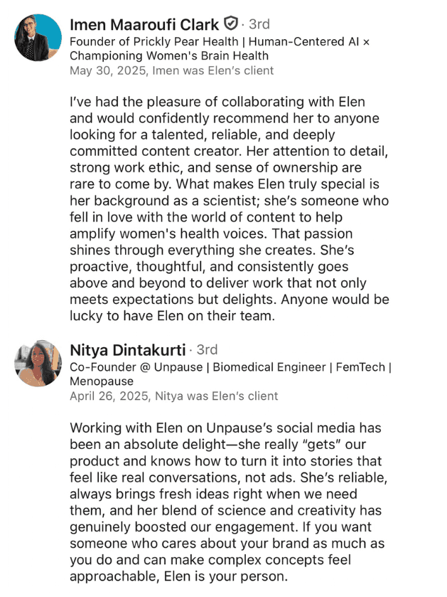 "What makes Elen truly special is her background as a scientist; she’s someone who fell in love with the world of content to help amplify women's health voices. That passion shines through everything she creates" - Imen Maaroufi Clark, Founder of Prickly Pear